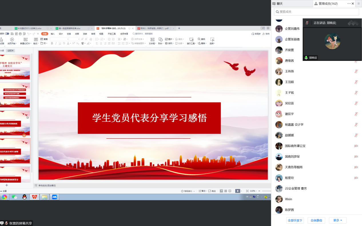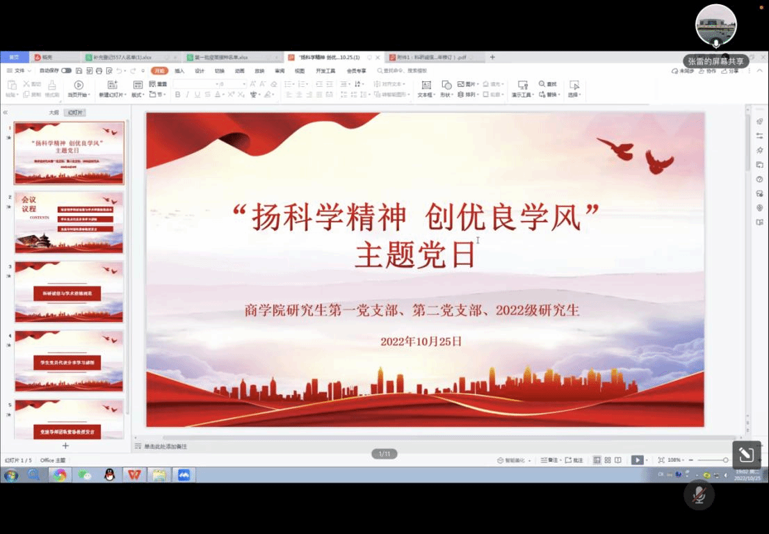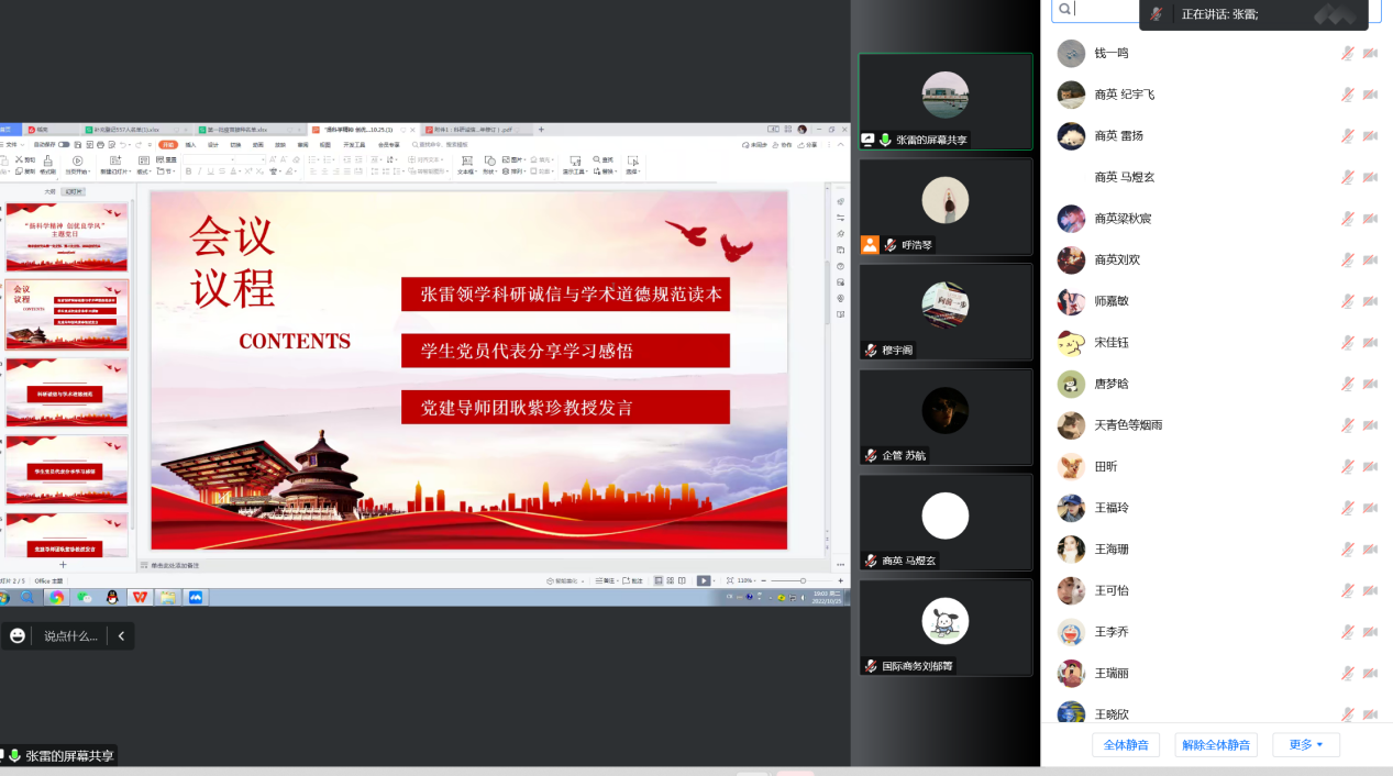 学生党员代表李颖、郑姝欣分享学习感悟。两位党员分别从学术道德和中国传统文化的角度指出,做科研时要具备独立思考能力与创新能力,不可急功近利,反对一切投机取巧行为;只有坚持艰苦奋斗的学风,科学研究才能真正有所创新、有所突破。