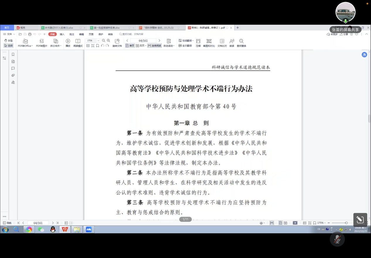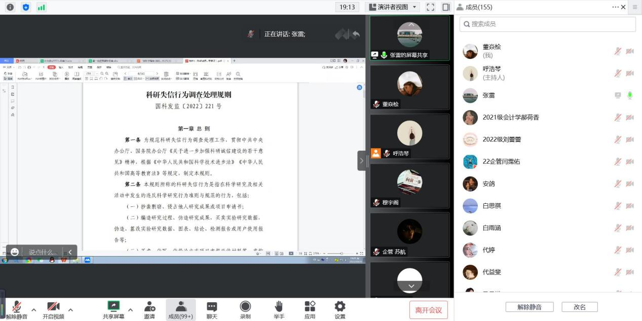 会上,张雷领学了西安外国语大学印发的《科研诚信与学术道德规范读本》,强调了遵守学术道德规范的重要性,随后从科研失信行为内容、学术不端认定与处理方法及案例三方面展开详细讲述。并结合学生实际相关的课程论文、科研项目申报等,提醒大家在学期间注重科研诚信。