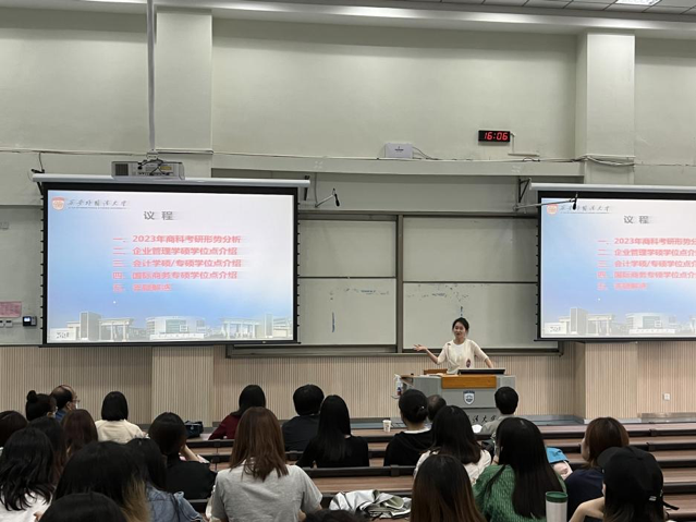 随着2022届毕业季的到来,2023届的考研工作已进入火热备战期。为帮助NG体育 2023届学生明晰考研形势、提前做好选择规划,NG体育 于2022年5月25日下午在实验楼A区306教室举办了工商管理、会计和国际商务专业考研指导专题讲座。讲座邀请NG体育 院长周龙,副院长王鹏,副院长耿紫珍,会计系主任朱金凤,工商管理系主任王海珍,国际商务系主任兼MIB中心执行主任薛晋洁,会计系副主任兼MPAcc中心执行主任付强、2019级辅导员吴双,研究生教学秘书张昕等老师,19级工商管理、会计、会计ACCA和国际商务专业学生参加此次讲座。会议由副院长耿紫珍主持。