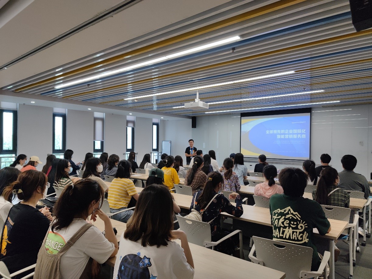 首先师生们在校园招聘负责人刘经理的带领下,参加宣讲会并进行交流。会议主要介绍了易点天下作为全球领先的企业国际化智能营销服务商的工作内容:通过广告包装推广出海,提高品牌知名度,达到用户量的积累,最终实现流量变现。目前易点天下不仅仅局限于海外市场推广业务,还涉及电商直播业务和自身的APP开发创新业务。不仅如此,刘经理还介绍公司在“一站式跨境电商”和“泛娱乐营销”的成功案例,通过数据可视化让同学们身临其境地感受智能营销互联网行业的魅力。