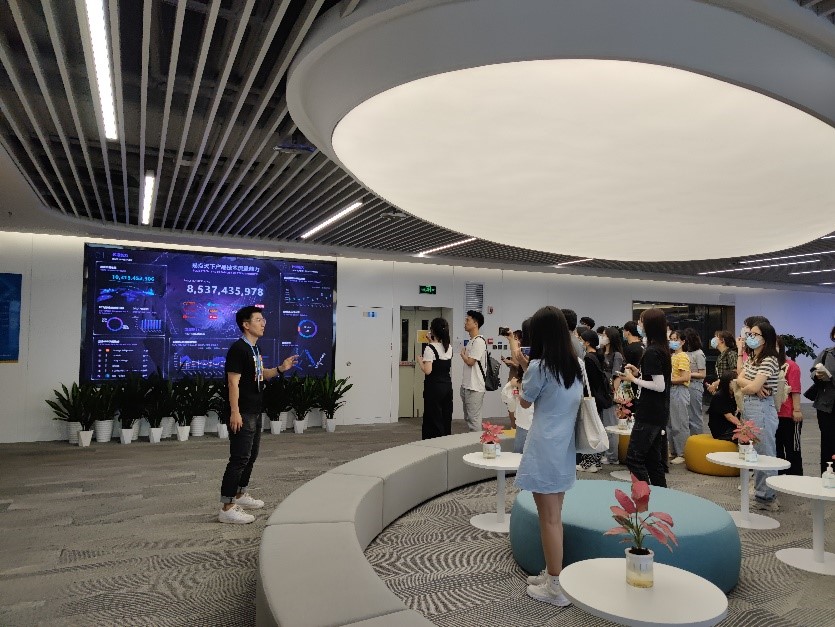 分享之后,刘经理和赵经理带领同学们参观了公司的主要业务工作区域,包括公司健身房、直播间、技术中心、共享服务中心、以及国内外的运营中心。让同学们近距离接触公司办公场所,感受轻松的工作环境,愉快的员工氛围。通过此次“移动课堂”的学习参观,同学们对互联网公司国际化智能营销服务有了更加清晰、更全面的认识,也进一步缩短了课堂理论知识和企业实践之间的距离。最后,刘经理与同学们建立了微信群,为感兴趣的同学提供良好的实习平台和更多的实习机会。(图:李炫松 文:雒佳彤)