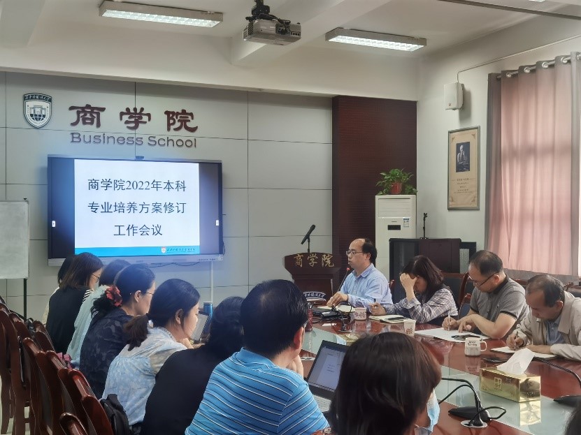 副院长王鹏介绍了2022版培养方案总体原则与要求,并对培养目标、培养机制、学分要求、课程编排原则等细则做具体解释说明,他提出本次培养方案修订旨在“减负担、增能力”,以全面提升学生综合素养为目标,扎实推进2022本科人才培养方案的修订。院长周龙提出应加强学生语言竞争力,各专业应发展专业特色课程,商英课程设置加大商科比例,将英语能力训练融入到商业案例当中等建议。会上,各系主任、专业带头人与教授代表共同探讨本科课程设置中存在的问题并提出解决方案,如丰富实习实践活动、以考代教、产教融合、校企融合、推进双语教学及全英授课等。