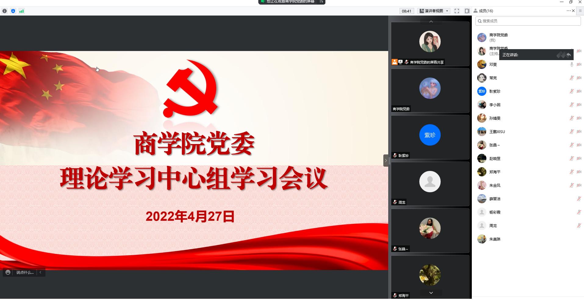 2022年4月27日下午,学院党委理论学习中心组在线召开2022年4月学习会。全体中心组成员参会,会议由党委书记邓雯主持。