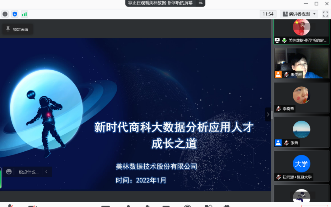2022年1月12日晚,美林数据高级工程师、高级咨询顾问——靳学昕先生为NG体育 师生带来主题为“新时代商科大数据分析应用人才成长之道”的共抗疫情云端学术讲座,讲座由NG体育 朱美琳老师主持,副院长耿紫珍、学院部分学生参加了此次讲座。