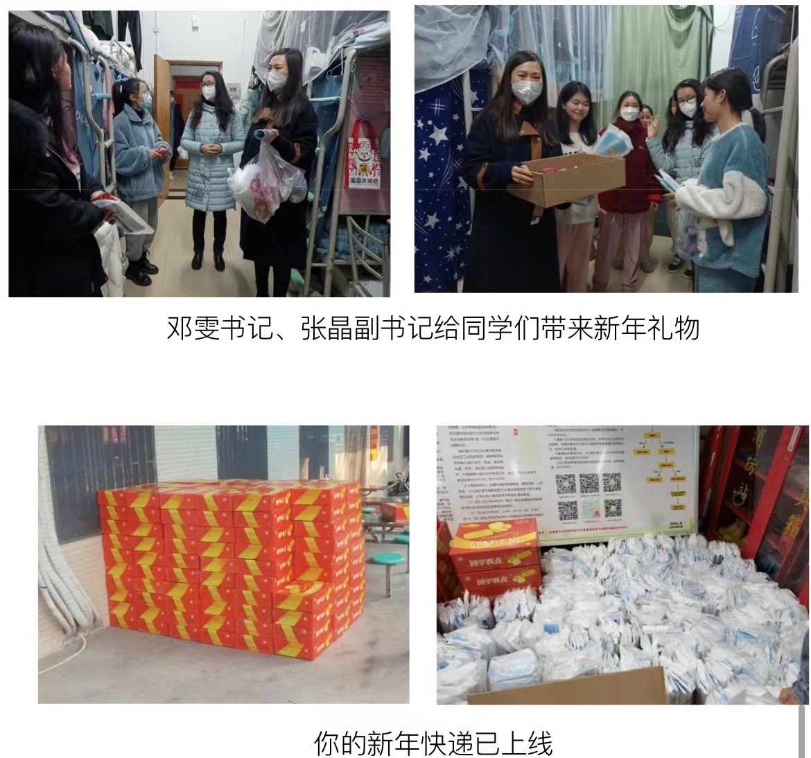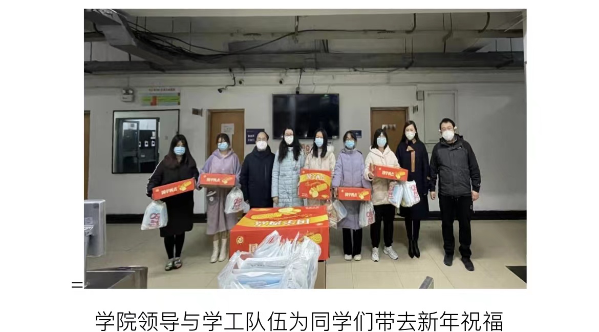 随后,NG体育 党委书记邓雯、副院长王鹏、副书记兼副院长张晶辅导员一行深入走访学生宿舍,为学生送上鼓励、支持、祝福与问候,并带去新年慰问品,让“宅”在宿舍的同学们感受到温暖与陪伴。老师们悉心询问学生们的思想与生活状况,叮嘱同学们如果感到压力大或有其它困难,一定要及时向学院反映,也向同学们对学院疫情防控工作的理解和支持表示感谢。