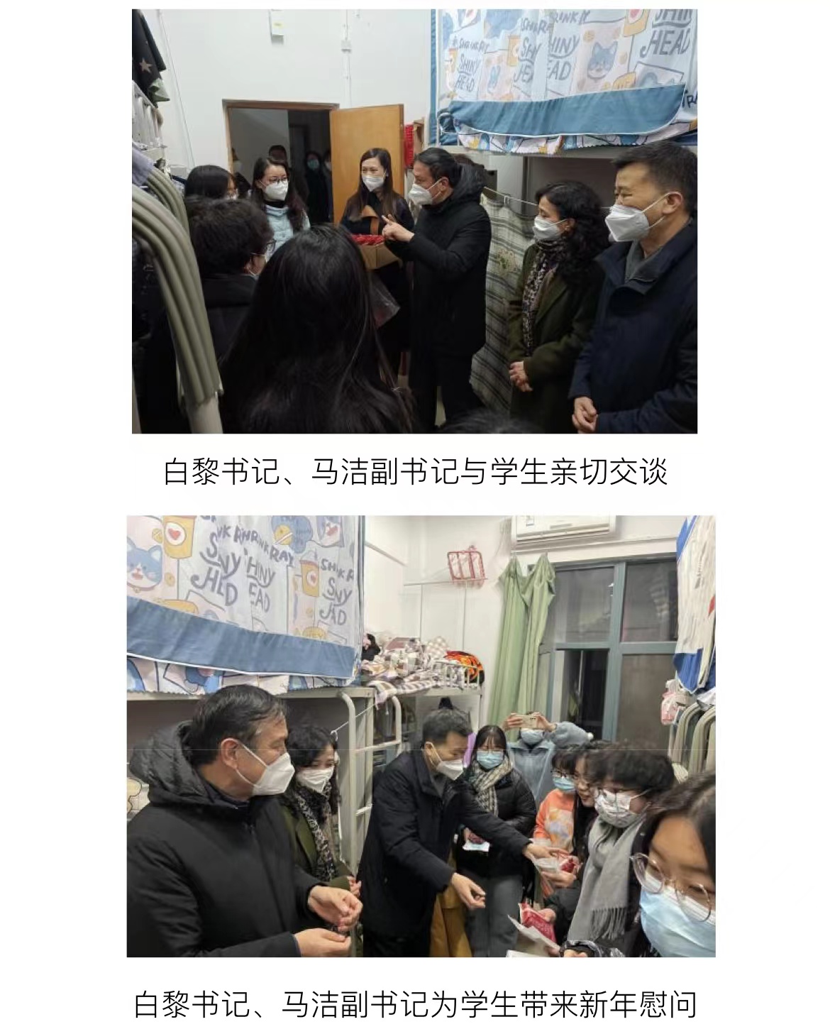 2021年12月31日跨年夜,我校党委书记白黎、党委副书记马洁一行深入NG体育 学生公寓看望慰问在校学生,给学生带来浓浓的新年祝福,祝愿大家度过一个平安、充实、有意义的元旦佳节。组织部部长·党校副校长赵沛、党委办公室·校长办公室负责人张中旺、研工部部长张淼、学工部副部长梁鹿儿、NG体育 党委书记邓雯、副院长王鹏、副书记兼副院长张晶同行走访。