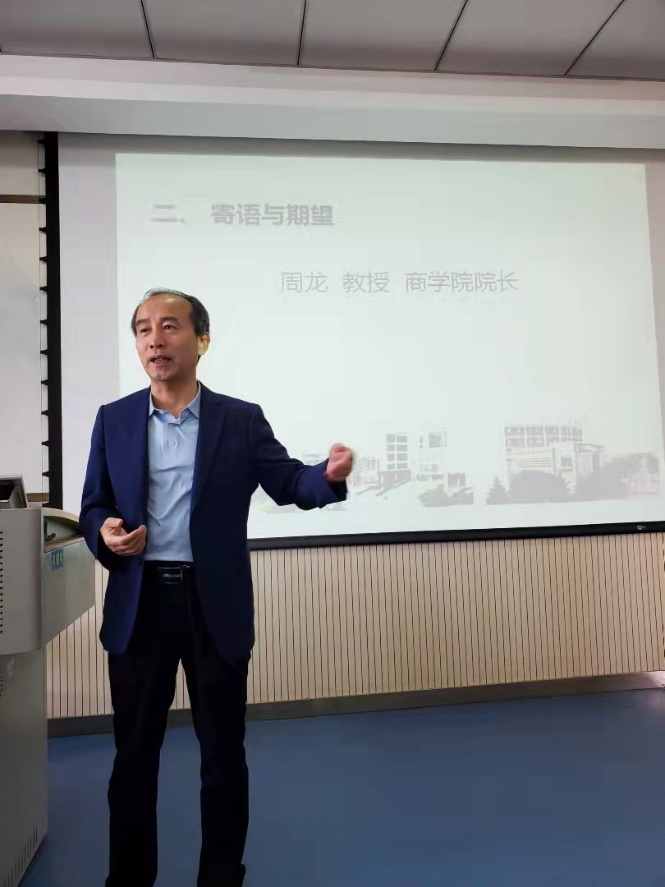 周龙代表学院表达了对2021级会计专业新生的热烈欢迎,他从会计学专业特色出发,寄语学生形成思维严谨、提高英语水平、提升综合能力。并在专业学习、综合素养及人际相处等方面为新生提出了宝贵的建议,希冀学生多向老师们学习请教,与老师形成亦师亦友的良好关系。