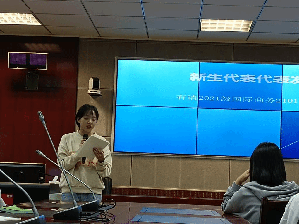 最后由孟佳欢同学做新生代表发言,说了一下自己对国际商务专业的理解和来到西外的高兴,并提到了西外学子在食堂和自习室,图书馆都能看到他们的身影。