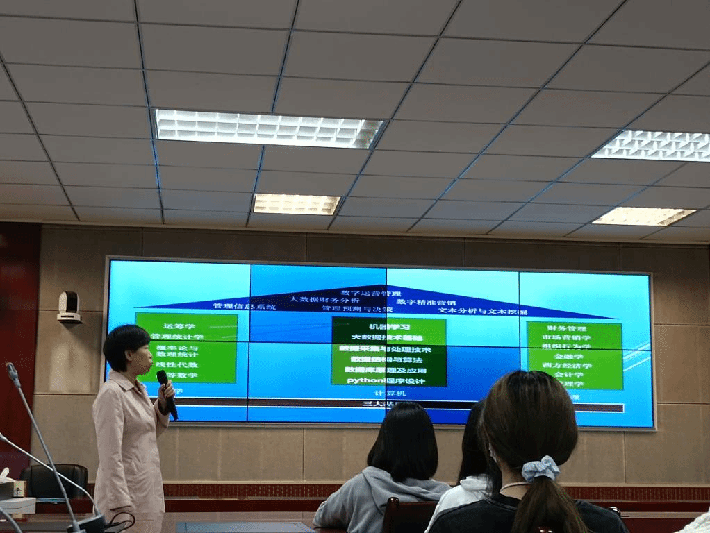 系主任朱美琳和薛晋洁老师,一起来介绍大数据管理与应用专业和国际商务专业。讲解了课程的结构,研究生培养的特色,分享了自己对这门课程的看法,还有学分的排比。最后老师也讲了几点对我们的希望上大学要做事先学着做人,培养自主学习的能力和养成系统思维的好习惯。