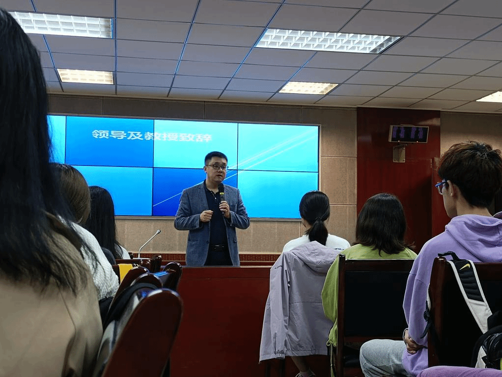 研究生院副院长申海教授对在场的新生提出了希望和建议。首先,申老师鼓励同学要多锻炼自己的能力。从以下三个方面进行。第一,申老师建议掌握一门外语,这会使大家以后很有优势。第二,有能力的话可以使自己精通软件。第三,要不断丰富自己,使自己有可以背靠的理论。这使同学们受益匪浅,对大学有了进一步的打算。