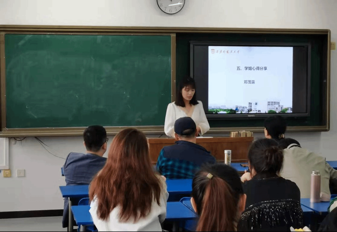 接下来是王艳粉学姐和邓茂露学姐就研究生的学习生活为我们分享了他们自身的心得体会,重点分享了研究生的学习规划以及学习方法,为同学们今后的研究生生活提供了建设性的意见。