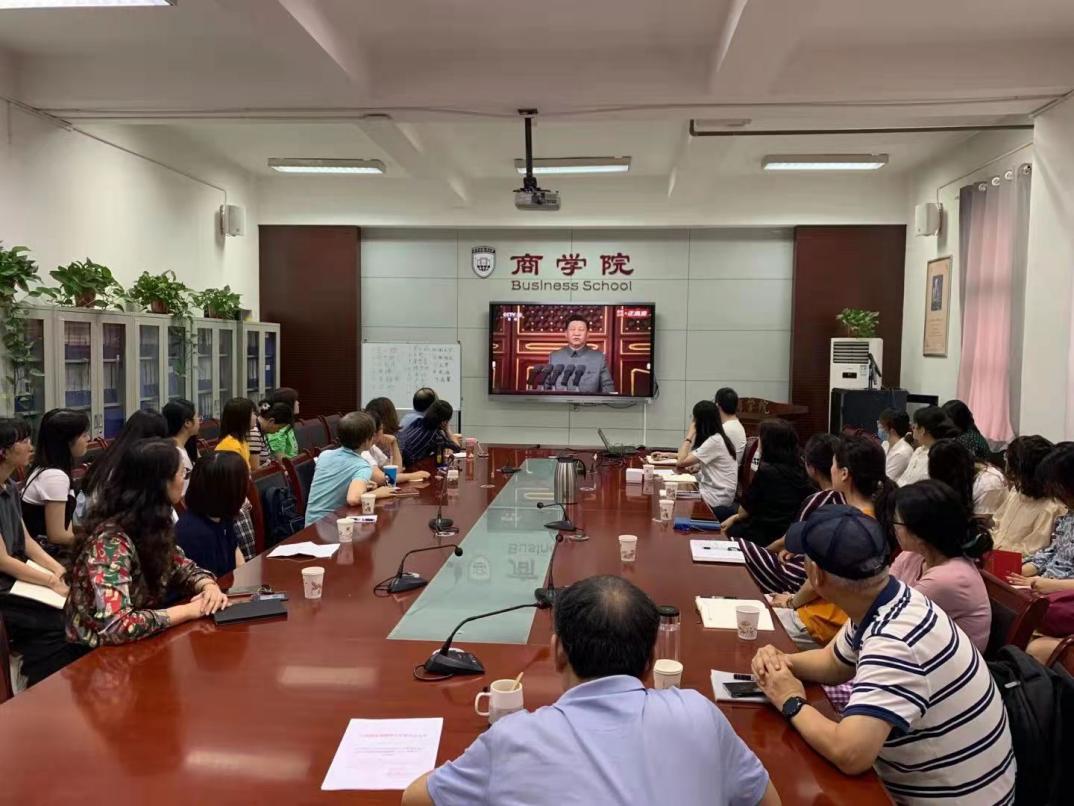 上午八点整,全体与会人员端坐在屏幕前,怀着激动的心情等待“庆祝中国共产党成立100周年大会活动现场直播盛况”,随着100声礼炮响彻云霄,国旗护卫队护卫着五星红旗,迈着铿锵有力的步伐,从人民英雄纪念碑前行至天安门广场,庆典活动正式开始。庆典上,习近平总书记发表重要讲话,深入总结了中国共产党的百年光辉历程和宝贵经验,庄严宣告中华大地全面建成了小康社会,科学展望了中华民族伟大复兴的光明前景。同时,对广大青年提出殷切希望,他讲到,未来属于青年,希望寄予青年。新时代的中国青年要以实现中华民族伟大复兴为己任,增强做中国人的志气、骨气、底气,不负时代,不负韶华,不负党和人民的殷切期望!观看直播后,大家反响热烈,与会党员纷纷表达了对中国共产党成立100周年的美好祝福以及对党未来发展的坚定信心和决心。研究生第二党支部学生代表罗蕊苗、赵子文谈到,作为大学生党员,要珍惜眼下的幸福生活,勤奋学习,做有担当、有志气、有骨气的青年,不负人民,不负时代。教师代表唐慧利老师、常姗姗老师也表示,“初心易得,始终难守”,在今后的工作中,将时刻牢记初心使命,传承红色基因,赓续奋斗传统,扎根教育事业,为办党和人民满意的教育而砥砺前行。周龙院长表示,通过在井冈山、延安等革命圣地的参观学习,更加切身地体会到我党的宏阔胸襟、非凡气度、历史担当与高远追求,中国共产党是中国历史发展的必然选择,中国共产党让中国人民的志气更高,骨气更硬,底气更足。作为党员,要在各自的领域上发挥所长,深耕细作,努力奋斗,用实际行动传承和发扬革命精神,努力创造个人价值。