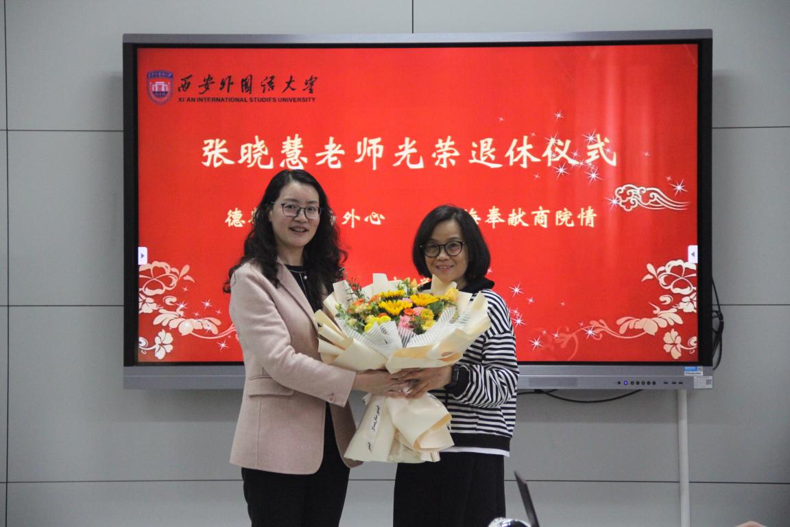 会上,院长周龙代表学院对张晓慧老师为学院建设发展做出的贡献致以崇高的敬意和衷心的感谢。回顾过去,张老师从教33年,兢兢业业,潜心教学,在商务英语教研室担任研究生主任,勇挑重担,尤其在商务英语国家级一流专业建设中功不可没。周龙院长希望张老师荣休后一如既往地关心和支持学院工作,也为商英教研室和其它教研室的年轻教师予以指导。