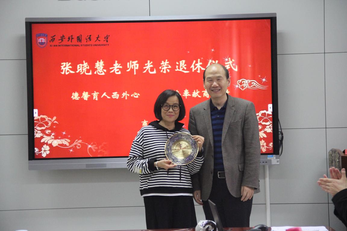 欢送仪式伴随着歌曲《光阴的故事》和《明天会更好》深情、优美的旋律开始。校党委副书记、纪委书记、监察专员王强首先为张晓慧老师颁发光荣退休纪念牌,院党委书记邓雯为张晓慧老师献花。