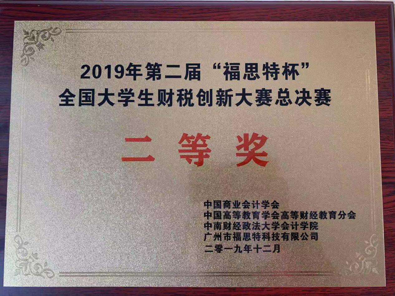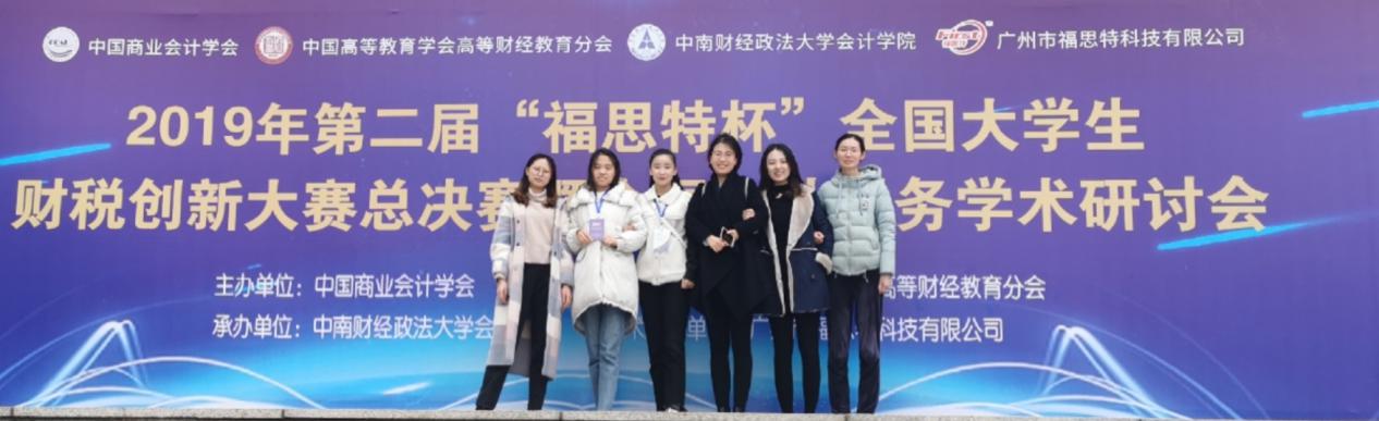 12月14日,由中国商业会计学会主办,中国高等教育学会高等财经教育分会指导,中南财经政法大学会计学院承办,广州福思特科技有限公司提供技术支持的2019年第二届“福思特杯”全国大学生财税创新大赛总决赛暨全国会计税务学术研讨会在中南财经政法大学南湖校区圆满结束。由NG体育 乔引花、刘传宇、艾勃成老师担任指导老师,2017级会计学专业陆佳烨、凌洁茹、秦佳莉,会计ACCA方向教改班贾荟宁和审计学专业李旭同学组成的代表队,在激烈的角逐中,凭借扎实的专业知识、默契的团队合作从全国众多参赛队伍中脱颖而出,荣获本次大赛二等奖。