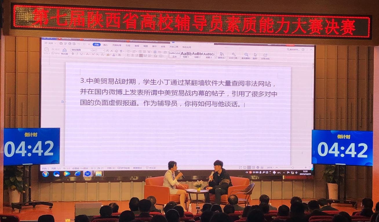10月23至25日,陕西省第七届高校辅导员素质大赛在我校举行,来自我省83所高校的127余名辅导员参加此次大赛。通过笔试、案例分析、理论宣讲、谈心谈话四个环节的激烈比拼,NG体育 2016级辅导员弋甸园荣获大赛一等奖。省委教育工委委员、省教育厅副厅长王紫贵、省委教育工委学工部部长、省教育厅学生处处长唐澍等上级领导以及我校党委书记白黎教授、副校长李京昊和来自全省24所高校的专家评委莅临决赛现场。