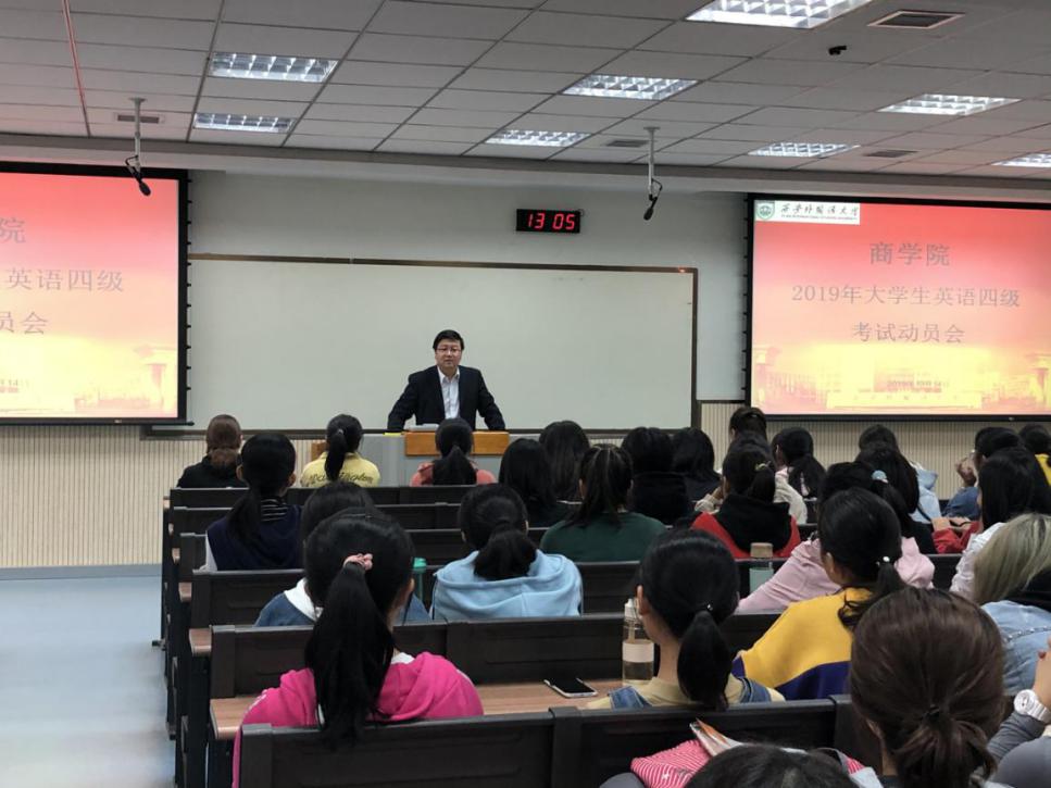 为提高学生大学英语四级成绩,进一步提升本科生英语教学质量,NG体育 商务英语教研室为2019级本科生制定大学英语四级考试专题辅导。10月14日中午,NG体育 2019级在长安校区SA202教室召开大学英语四级考试动员会。NG体育 副院长刘军伟、商英教研室教师张若月、2019级辅导员叶妮及2019级本科会计ACCA、工商管理卓越实验班的全体同学参加了此次会议。会议由2019级辅导员叶妮主持。