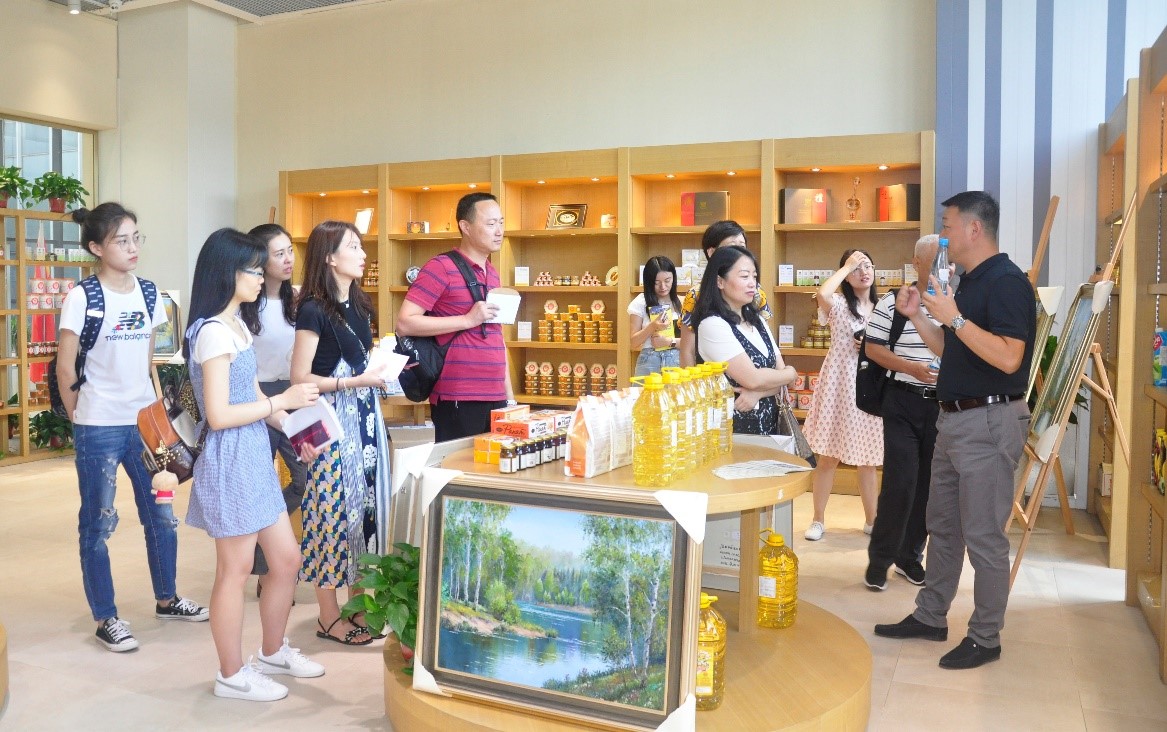 调研师生重点参观了集团下设的“西安-独联体国家进口商品展示中心”,何诚董事长重点介绍了展示交易中心主要功能和从哈萨克斯坦、俄罗斯、白俄罗斯等独联体国家进口销售的天然成熟蜂蜜、食用油、面粉、饮料、巧克力、红酒、伏特加等特色商品销售情况,并对“一带一路”倡议下,创新国际商务合作模式及电子商务销售等与杨霞院长进行深入探讨和研究。调研师生就销售渠道、产品包装、品牌建设等问题进行了询问和了解。