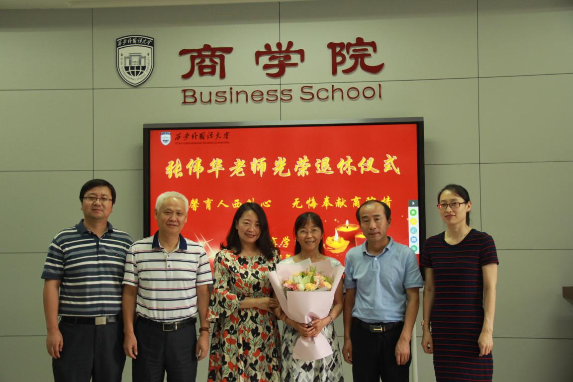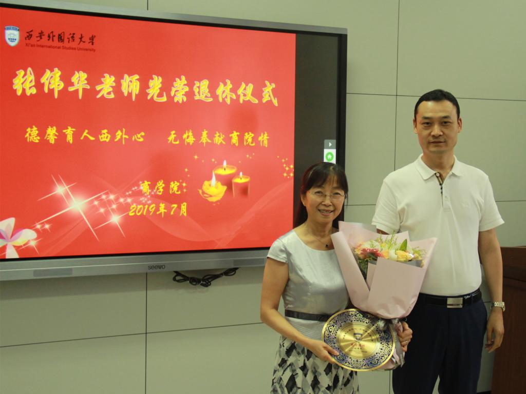 会上,杨霞院长代表学院对张伟华同志对学院建设发展作出的贡献致以崇高的敬意和衷心的感谢。张老师从教33年,忠诚党的教育事业,在商务英语教研室工作十年来,潜心教学,勇挑重担,无私奉献,关爱学生,关心和帮助青年教师,被教师亲切的称为“张大姐”,被学生称为“张妈妈”。2014年任学校及学院教学督导以来,她认真履行岗位职责,及时发现课程建设、教风与学风建设、教学环节等方面存在的问题,积极为学校学院建言献策,发挥了一名督导和老教师应有的作用。
