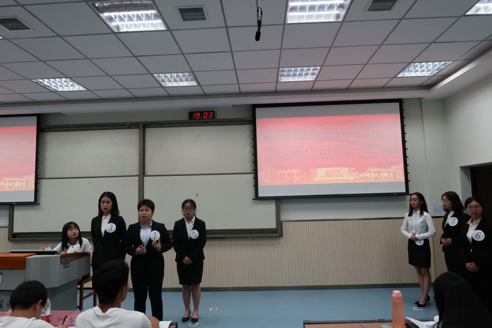 本次大赛分为“无领导小组讨论、猜历史人物、党的理论知识问答与时事分析”三个环节,主要从政治素质、逻辑思维、知识积累、人际沟通、语言表达等方面考查学生。在第一轮无领导小组讨论中,六名选手分为两组,分别就习近平总书记提出的“人类命运共同体”理念,从民族与世界的关系展开深入思考与讨论。随后,选手们运用红歌名称抢答、历史人物判断等方式开始了第二轮比拼。在第三环节中,六名选手现场抽题作答,在时事分析部分,选手们针对食品安全、世界无烟日、非物质文化遗产保护等问题提出了自己的看法和建议。