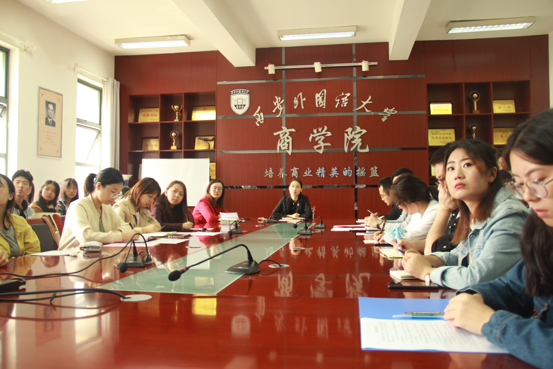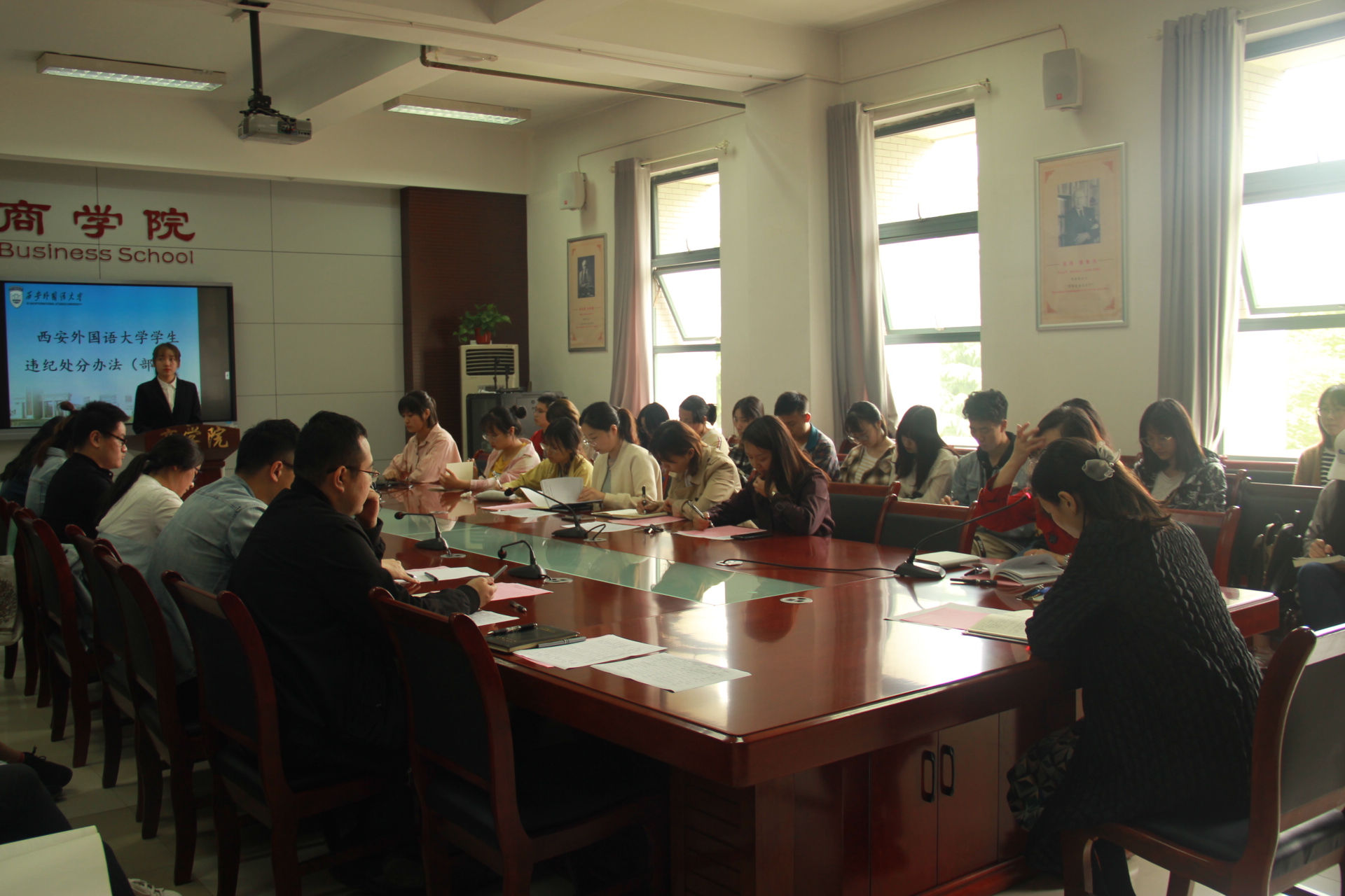 启动仪式共分为三项,常姗姗老师首先宣读了《西安外国语大学学生违纪处理办法》,强调校纪校规,督促学生遵循在校行为准则,着重学习违纪违规处理办法,从源头上杜绝违纪舞弊行为。本次“树理想,促学风”学风建设系列活动包括七项活动:(1)“学习《学生手册》,争做遵守校纪校规好青年”活动;(2)开展“shine生活,show真我”文明寝室评比活动;(3)开展“学风吹,战鼓擂”班级学风评比活动;(4)举办“商华正茂读书交流会”;(5)举办“话专业,浓学风学习交流分享会”;(6)开展“青春筑梦,党员助学”活动;(7)学习成果展,从多角度、全方面加强学生学风建设,提高学生自主学习能力。梅林竹老师在讲话中指出开展学风建设活动的必要性与长效性,学风建设是学生管理工作重点之一,要常抓不懈,共同营造良好的学风。同时她对学生们提出三点要求,一要从思想上重视,严于律己,内省反思,遵守课堂纪律,做好学生本职工作;二要诚信考试,诚实做人,学习优秀典型,自觉抵制一切学术不端与作弊行为;三要多读书,多实践,主动参加校内各项活动,不断拓展自己的能力,提高自身综合素质。学生代表李慧同学带领全体到场学生宣誓承诺。