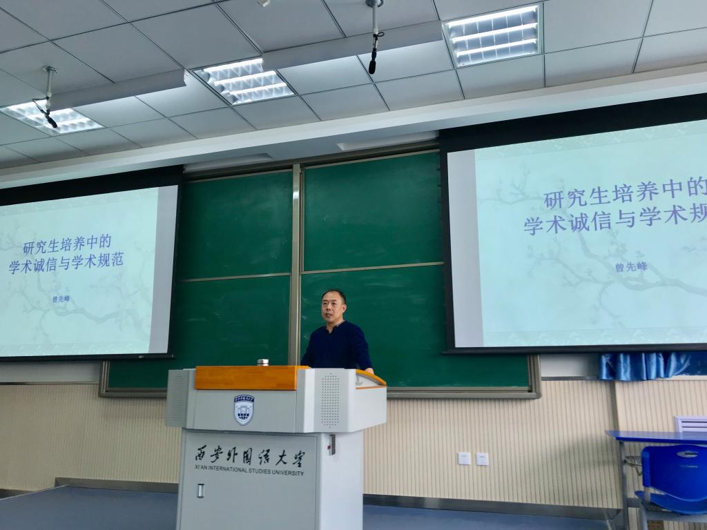 随后曾先峰教授为到场学生详细讲解了研究生培养过程中的学术诚信和学术规范等问题。曾老师以“诚信做学术,规范做学术,规避学术不端”为主题,阐明了现阶段存在的学术不端问题的原因,介绍了学术不端相关概念界定、相关规定要求以及教育部相关处理规定。