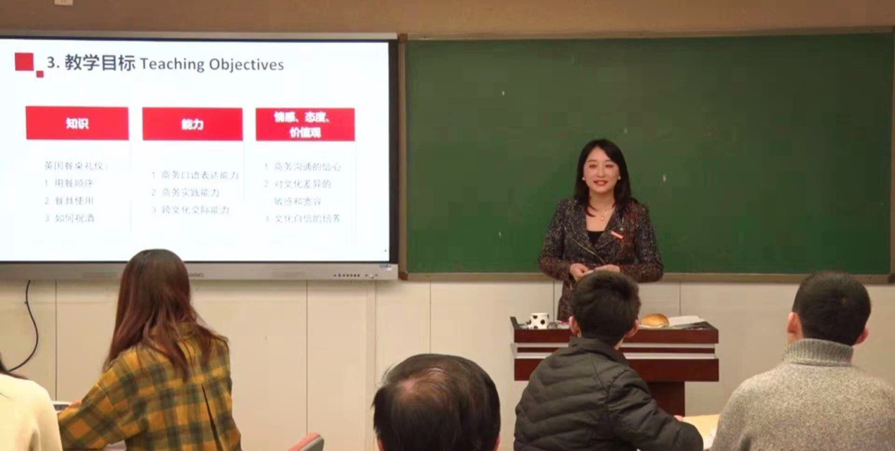 卢珊老师本次讲授课程为《英语国家商务国情》。她首先结合商务英语学科特点和学生的认知能力、学习风格,设定了“知识—能力—情感、态度、价值观”的三维教学目标,通过真实、有效、丰富的教学内容和教学手段突出了学生的主体地位,以英国商务礼仪为主题,介绍了餐桌礼仪中的各种规则和禁忌,对比分析了中英商务用餐礼仪的差异。比赛现场,卢珊老师授课生动活泼,课堂氛围良好,通过学生录制视频、情境表演、实物操作展示、调查问卷等多种形式进行了课堂教学方法的创新,并通过课中对学生进行鼓励、纠正、示范,学生互评,课后进行诊断式评价创新,有效地激发了学生的学习兴趣,将学生的知识、经验进行了修正、强化和塑造。