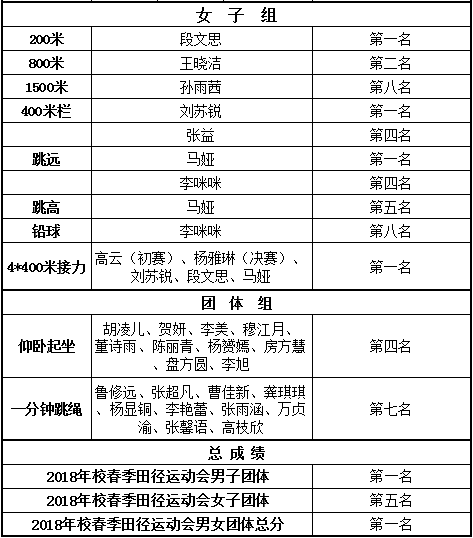 在校运会两天的激烈角逐中,NG体育 运动健儿员各展其长,顽强拼搏,赛出了高水平、高素质。男子组中,4×100米接力、4×400米接力、400米、110米栏、400米栏均取得第一名,女子项目中,200米、400米栏、跳远和女子团体4×400米接力赛等9个项目中纷纷夺魁,NG体育 教师也在教职工比赛项目中荣获50米迎面接力赛第二名。