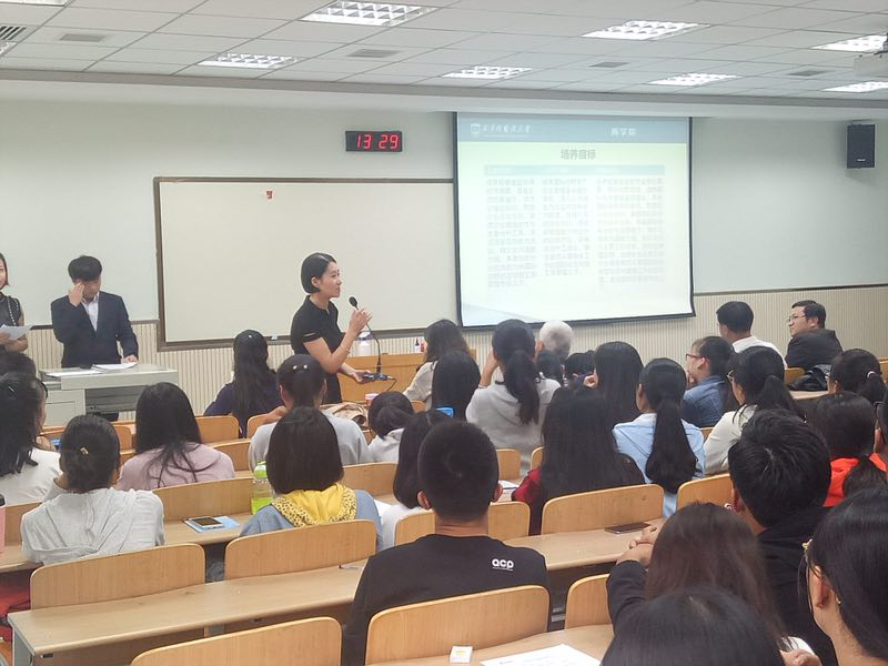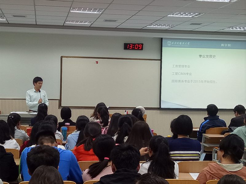 在郑海平副教授振奋人心的发言过后,工管教研室副主任毕可佳老师系统介绍了国际商务、工商管理和工商管理CIMA三个专业的培养目标、课程结构及毕业前景和就业方向。