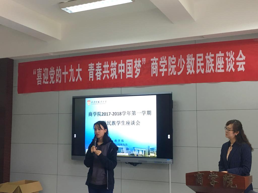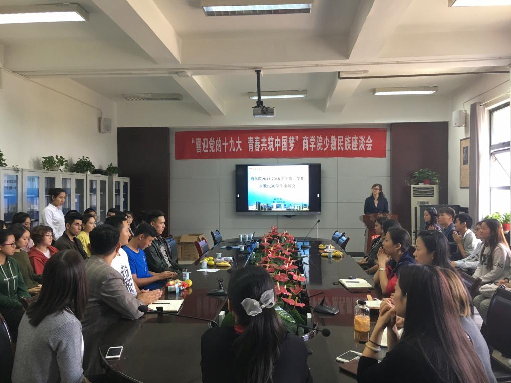 在喜迎国庆68周年和党的十九大即将召开之际,为进一步关心NG体育 少数民族学生的学习、生活,加强各民族学生文化习俗的沟通与交流,9月28日中午,NG体育 在G210召开以“喜迎党的十九大 青春共筑中国梦”为主题的少数民族学生座谈会。NG体育 党委副书记兼副院长梅林竹老师出席会议,会议由学工办主任兼团工委书记常姗姗老师主持,各年级辅导员以及全院18个少数民族共50余名学生参加了座谈。