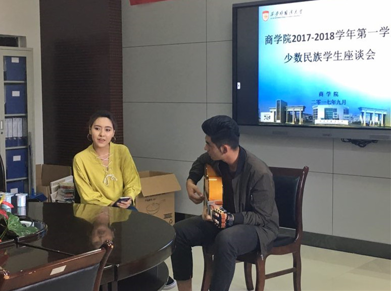 座谈会伊始,全体参会同学齐唱国歌并依次作自我介绍。随后,来自回族、维吾尔族、土家族、藏族、蒙古族等少数民族学生代表纷纷发言,分享了本民族的风土人情和大学生活中的收获,在不同的民族语言、各具特色的民族美食、精彩纷呈的民族艺术中加深了对彼此的了解。接着,与会同学就尊重各民族文化传统、弘扬青春正能量、维护中华民族大团结等方面畅所欲言,同学们结合自身成长经历和感悟,讲述了党和国家的政策帮扶和经济的快速发展,给各族人民生活带来的巨大改善,勉励大家珍惜大学的宝贵时光,对学校、社会和国家怀有感恩之心,以实际行动维护民族团结。最后,来自维吾尔族的两位同学带来吉他弹唱——新疆民歌《青春舞曲》,参会人员齐声合唱,营造出“民族一家亲”的温馨氛围。