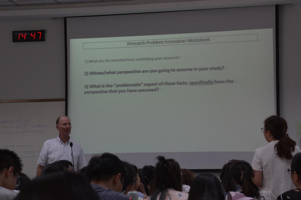 Steven J. Hite教授从数据类型、数据搜集方法、研究方法论及本体论四层意义上区分了定性研究方法和定量研究方法,为师生们介绍了定量研究方法的四种研究工具:问卷、面试、调查、案例研究等,并分析了各研究工具的特点。在“确定研究问题”讲座中,Steven J. Hite教授从研究受众、研究问题形成、相关研究实际问题和研究目的陈述方面对确定研究问题的过程进行了详细讲解。在“文献综述和理论框架”讲座中,Steven J. Hite教授为在座师生讲解了文献综述所需包含的三种信息:必要信息、重要信息以及研究兴趣点,并介绍了众多不同类型的理论框架。