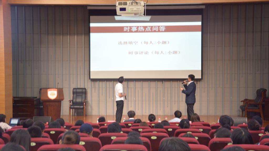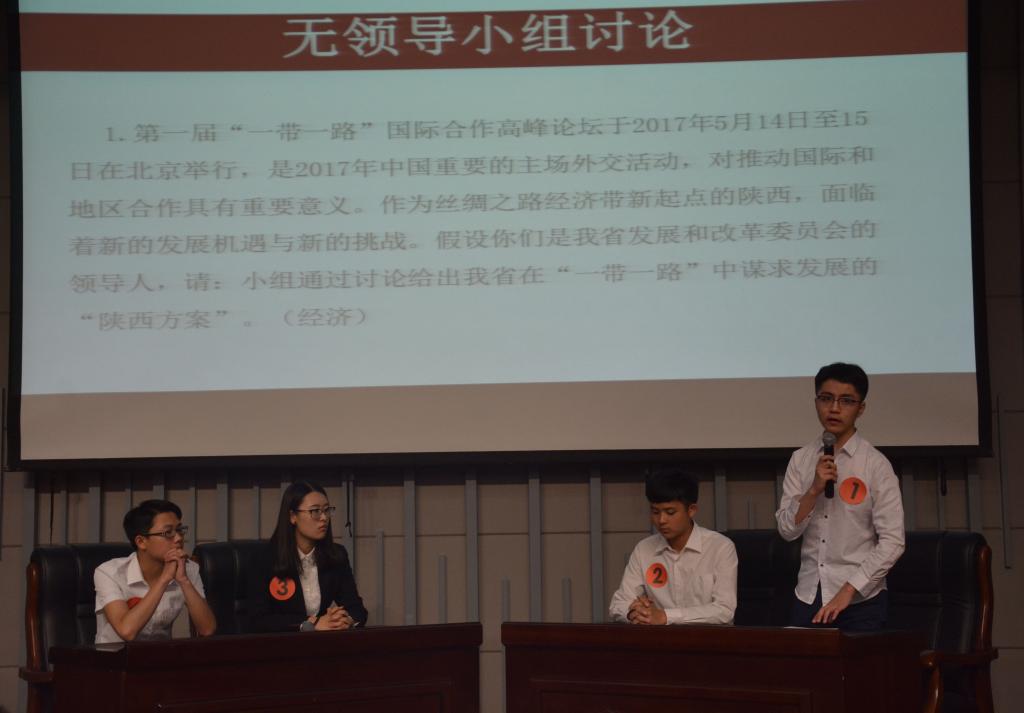 本次大赛分为“无领导小组讨论、个人展示、党的理论知识问答与时事分析”三个环节。本次比赛主要从政治素质、逻辑思维、知识积累、人际沟通、语言表达等方面考查学生。在第一轮无领导小组讨论中,八名选手分为两组,分别就我省在“一带一路”中谋求经济发展的“陕西方案”、我国在面对外交国防等压力时的应对策略这两个题目展开激烈讨论,并提出自己的解决方案。随后,选手们运用主题演讲、红歌表演等方式开始了第二轮比拼。在第三环节中,八名选手现场抽题作答,在时事分析部分,选手们针对“共享单车”、“山东聊城辱母案”、如何保护与传承传统文化、如何做到理性爱国等问题提出了自己的看法和建议。