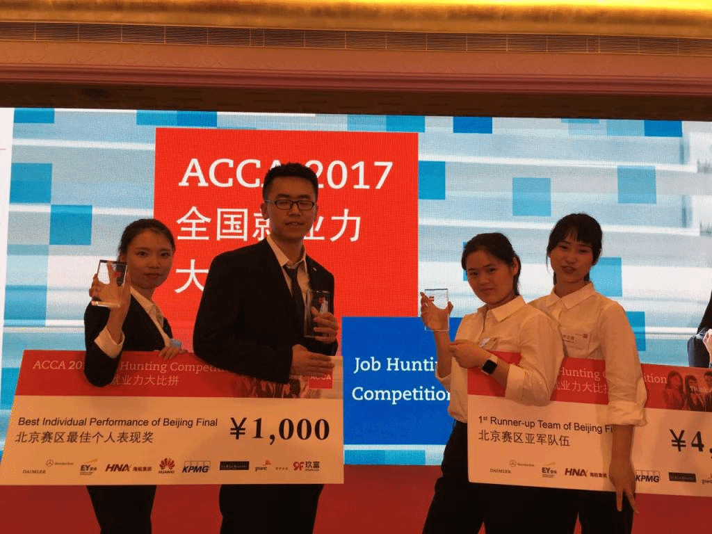 2017年ACCA全国就业力大比拼(ACCA Job Hunting Competition)北方赛区半决赛及决赛于5月5-6日在北京中国大饭店举行。由NG体育 2014级ACCA教改班学生郑用曦、郭晨阳、张慧洁,宋之言组成的我校代表队,凭借扎实的语言能力以及专业素养,经过连续两天的激烈鏖战,最终荣获北方赛区亚军,顺利晋级全国总决赛,其中张慧洁同学荣获最佳表现选手。