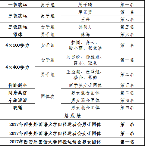 2017年4月27日-28日,西安外国语大学2017年春季田径运动会在长安校区体育场隆重举行。NG体育 以男子团体第一名、女子团体第一名,总分团体第一名的成绩实现大满贯的辉煌战果。