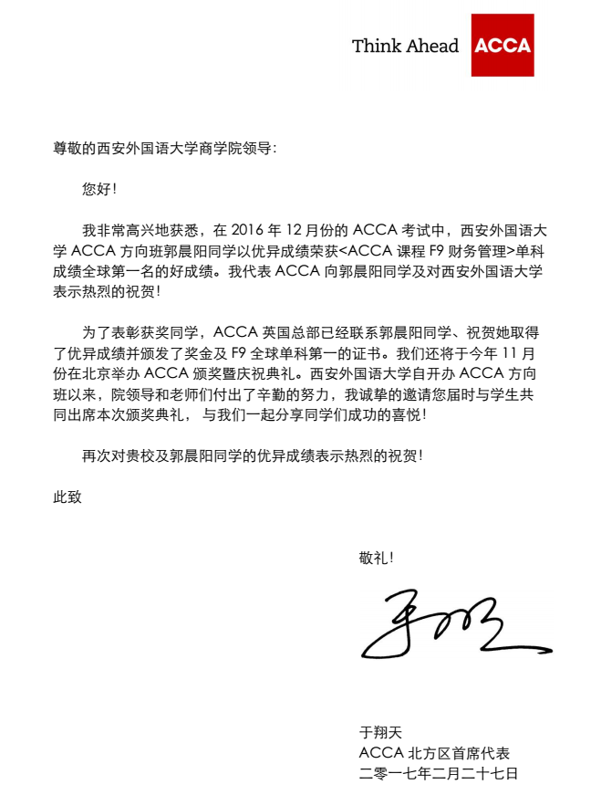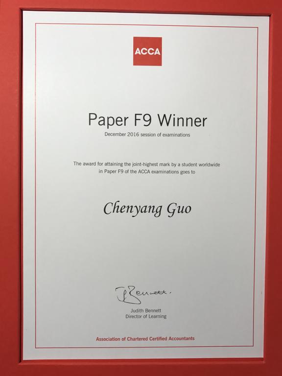 近日,ACCA(特许公认会计师公会,The Association of Chartered Certified Accountant)公布2016年12月份全球统考成绩,在《Financial Management》(F9)课程考试中,NG体育 2014级商务英语(ACCA)方向郭晨阳同学以93分荣获该课程全球第一,这是NG体育 教改班创办以来的又一次标志性成果。同时,2014级会计ACCA专业的罗小晶和宋之言同学,分别以91和89的高分,通过F9课程全球统考。F9的任课教师是NG体育 孙婧雯副教授。在此,我们对获得好成绩的同学和老师表示祝贺。