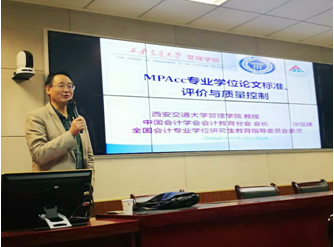 张俊瑞教授作为MPAcc教指委委员,负责完成了《全国MPAcc学位论文指导意见》起草与制订。他从研究生定位、MPAcc培养目标、能力要求等方面阐述了制订《指导意见》的原因;重点从学位论文基本要求、选题和论文类型以及格式规范等四个方面解读了学位论文标准,结合西安交通大学MPAcc培养教育的经验,对学位论文质量控制措施进行了详细说明。最后,张俊瑞教授用翔实的数据对MPAcc学位点评估中存在的问题和注意事项进行讲解。会后,我校教师就论文选题、学位点评估等问题与张俊瑞教授进行了交流。