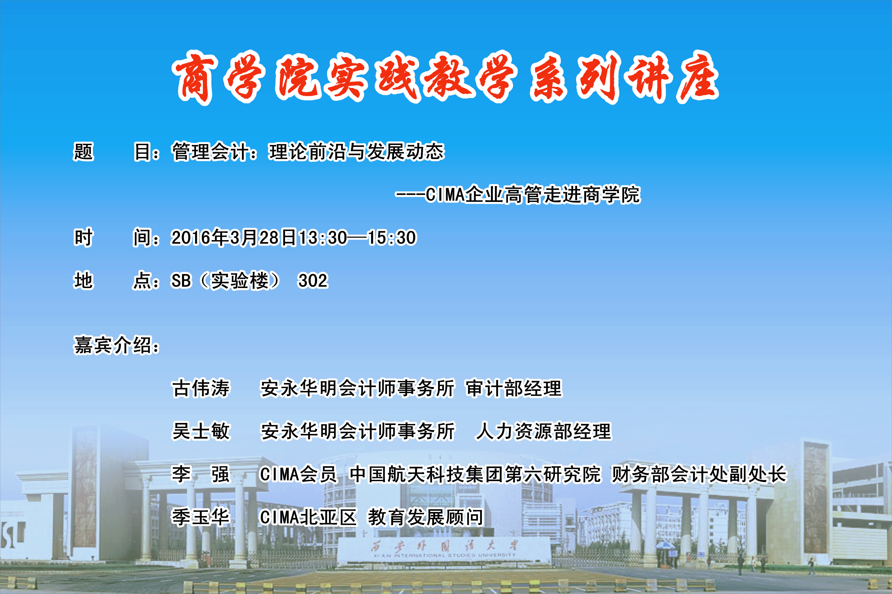 2016年3月28日下午,为提升CIMA教改班学生专业知识,了解更多企业实践经验,提高专业素养,NG体育 特邀安永华明会计师事务所(西安分所)审计部经理古伟涛先生、程凯先生、王锋革先生,人力资源部经理吴士敏女士,CIMA会员、中国航天科技集团第六研究院财务部会计处副处长李强先生,CIMA华东区域总监冯勇先生,CIMA北亚区教育发展顾问季玉华女士在SB302进行了关于“管理会计:理论前沿与发展动态“实践教学系列讲座。NG体育 院长杨霞博士,副院长刘军伟博士,“教育部新世纪优秀人才”杨鹏鹏教授,CIMA教学团队全体任课教师及学生共计100多位学生全程参加了本次讲座。