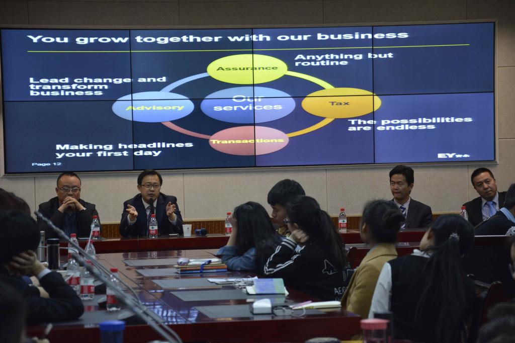 讲座由工商管理教研室副主任毕可佳老师主持。安永华明会计师事务所(西安分所)审计部经理程凯先生首先开始演讲。他凭借自身丰富的工作经验,借用企业并购、估值、上市的案例,主要阐述了传统财务会计与管理会计之间的差异与共同点。古伟涛先生对管理会计的工具性价值进行阐述,认为它是提高企业内部效率的重要途径。王锋革先生结合个人工作阅历,畅谈了管理会计与公司效益之间的关联性。吴士敏女士借助对安永事务所内部结构的介绍和当前就业形势的分析,鼓励同学们到安永实习锻炼。李强先生则以幽默的语言讲解了管理会计如何在企业决策中应用的问题,希望同学们充分了解未来管理会计的新挑战,新思维,新定位,新职能,努力提升技能,完善自己。最后季玉华女士从全面提升技术能力、商业能力、领导能力、人际能力等角度对CIMA考试体系做了详细的介绍。