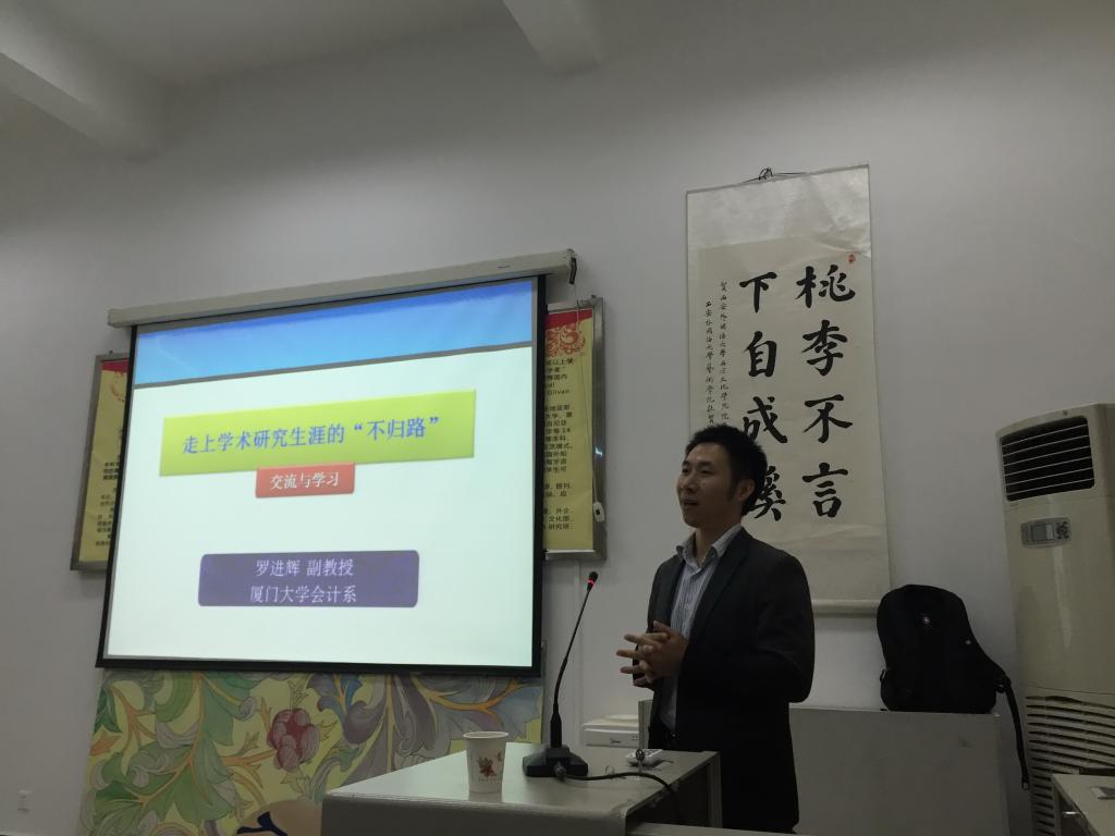 11月5日下午,厦门大学管理学院会计系副教授罗进辉博士生应邀为NG体育 师生作了一场题为《我是如何走上学术研究生涯的“不归路”》的学术报告。学院党委书记周龙副教授、科研院长郑海平副教授、会计教研室全体教师以及部分研究生参加本次学术报告。学术报告由会计教研室副主任王鹏博士主持。