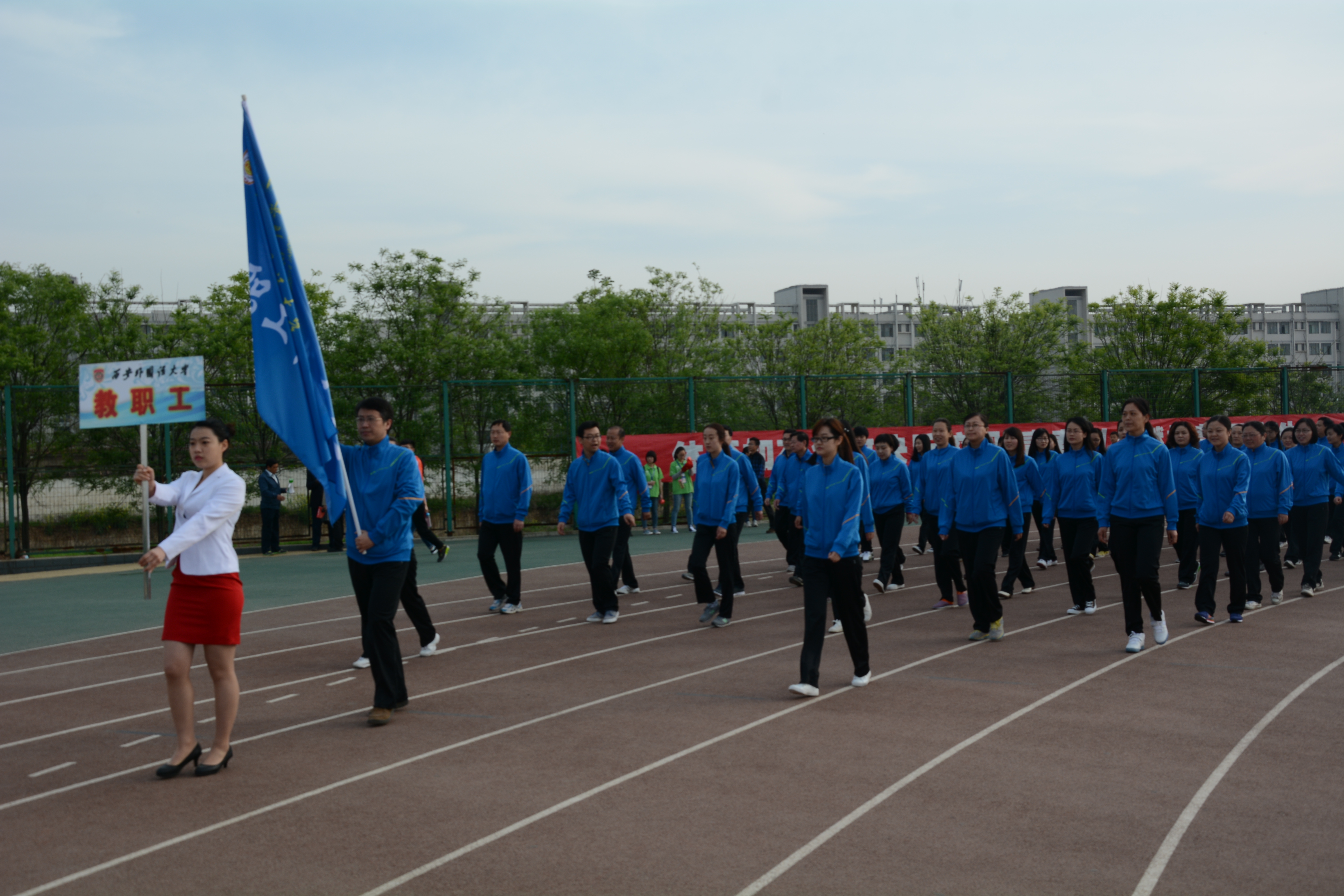 4月23日上午8时,运动会开幕式开始,NG体育 教工承担了本次校运会的教工运动员入场方阵。在激昂的运动员进行曲的伴奏下,由NG体育 53位教师组成的教职工代表队穿着整齐、迈着整齐的步伐,在“魅力商院,活力无限;顽强拼搏,勇敢争先” 响亮口号声中,英姿飒爽地走过了主席台,赢得了在场师生的阵阵喝彩。庄重肃穆的升国旗仪式后,NG体育 市场营销专业的赵晓罡老师作为全校教师代表进行发言,向全体师生和运动健儿送上的美好的祝愿和祝福。