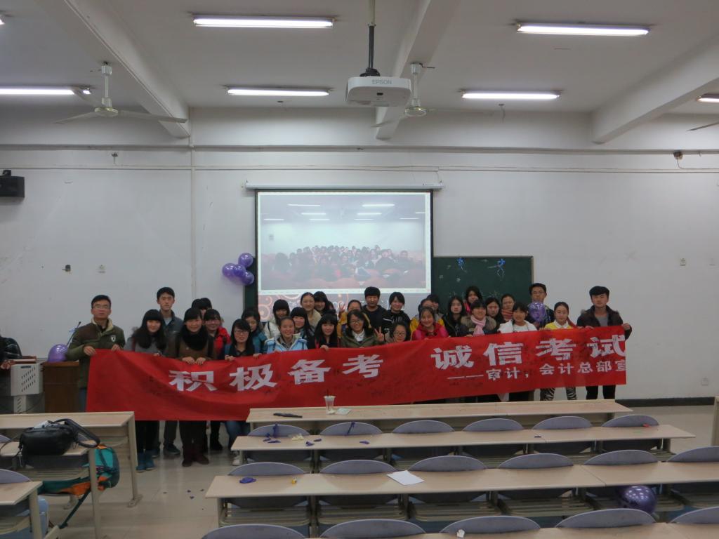 此次年级主题班会以专业为单位,在班会期间,各专业的同学代表分别上台做了精彩的发言。他们分享了自己本学期的学习情况和对诚信考试的态度,表明了对考试作弊行为的反对以及本次期末考试的目标。来自高年级的学姐学长们分别上台向同学们分享经验。他们以自己为例,就期末考试如何复习、准备,向同学们传授了丰富的经验,鼓励同学们积极备考,以充足的信心迎接即将到来的考试。 班委会成员宣读了《学生手册》中有关作弊处罚的规定,使同学们更加认识到了认真备考的重要性。随后,各班班长上台对本次主题班会进行总结。会议最后,全体同学起立郑重宣誓,并有秩序的在承诺诚信备考的横幅上签字,用以表明自己的态度和决心。