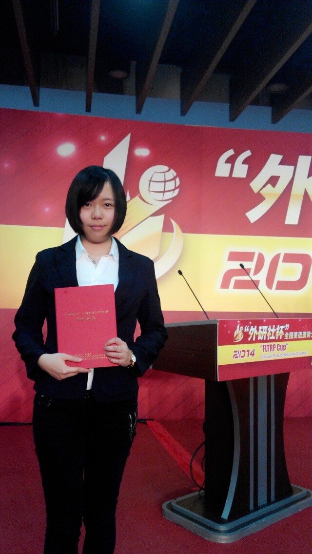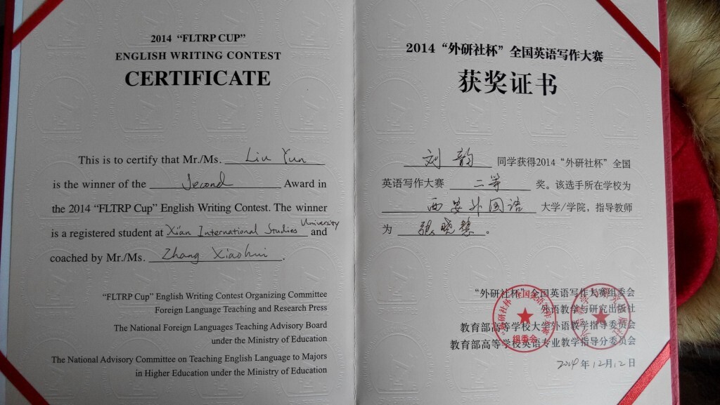 刘韵同学经学校初赛、复赛的层层选拔后,以优异的成绩在陕西省复赛中拿到特等奖,在随后于北京举办的决赛中,以一篇,命题作文《写给爸爸的信》及一篇自拟题目的议论文《to forbid exotic fashions or not》获得全国二等奖。