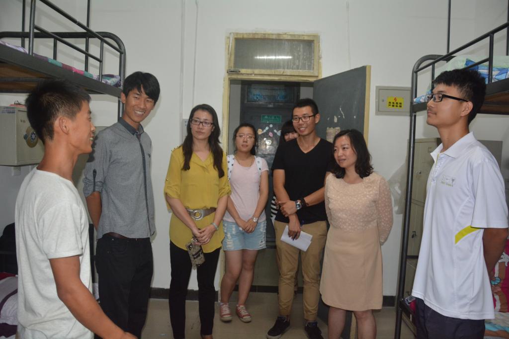 9月2日晚,NG体育 副院长杨霞老师,党总支副书记周龙老师、副院长兼党总支副书记邓雯老师、团工委书记常姗姗老师以及2014级辅导员葛轶蒙、田腾老师,一起前往2014级新生宿舍看望并慰问大一新生,了解新生的住宿与生活情况,鼓励他们积极适应新环境,与新同学互相帮助彼此关照,共同解决生活与学习中遇到的问题。期间,领导们也着重提醒新生要注意人身财产安全问题,提高安全意识、培养防范能力。新生们还就自己关心的专业学习、学校后勤保障等问题与学校领导和老师进行了交流。