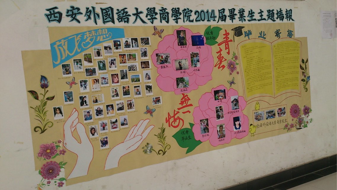 在2010级辅导员于富喜和李佳奇两位辅导员的带领下、姚立文同学的组织下,为2014届NG体育 毕业生制作出了一份含有纪念意义的毕业礼物---毕业生主题墙报。该墙报主要分为四个板块,第一部分“放飞梦想”展示了NG体育 2014届就业、出国、考研优秀的同学照片;第二部分“优秀干部”向大家介绍大学四年NG体育 优秀的干部;第三部分“优秀学生”给NG体育 的学弟学妹们展现了榜样的力量;而第四部分“青春无悔”中各位优秀毕业生的寄语体现了各位学长学姐对学弟学妹的嘱托与期望。