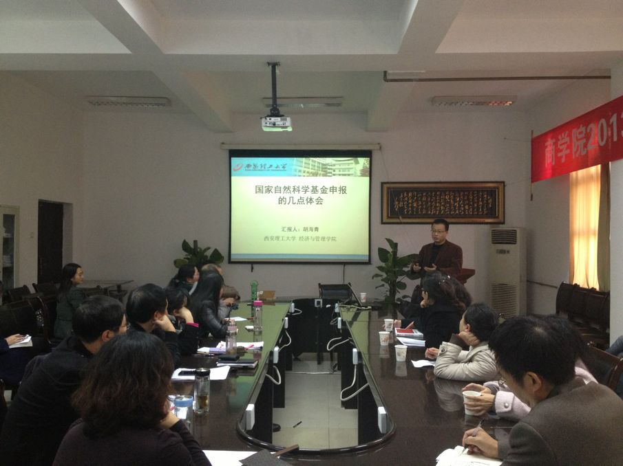 11月20日下午2点30分,西安交通大学经济学博士、日本德岛大学信息系统工学博士、西安理工大学经济与管理学院博士生导师、副院长胡海青教授应邀来NG体育 作学术讲座,与NG体育 教师交流在国家自然科学基金申报方面的体会。本次讲座由NG体育 副院长杨霞主持,党总支副书记周龙,副院长郑海平、刘军伟,以及工商管理、市场营销、会计、商务英语教研室的部分教师参加了本次讲座。