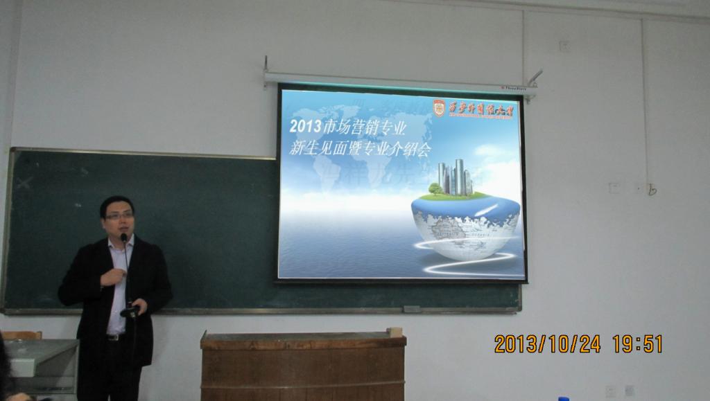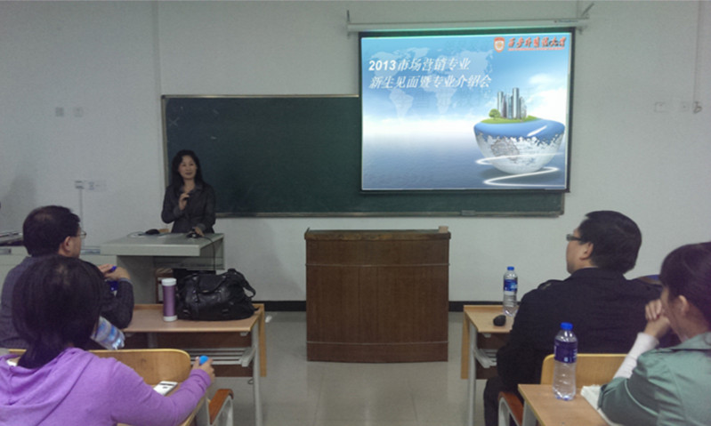 2013年10月24日晚7点,NG体育 市场营销教研室于SD105举办了2013级市场营销专业新生见面暨专业导入会。教务处处长、市场营销学科带头人李雪茹教授、工商管理学科带头人杨鹏鹏教授、NG体育 客座教授、SK能源(中国)有限公司西区销售总监冯祥龙先生、市场营销教研室主任赵晓罡老师、工商管理教研室主任毕可佳老师、商务英语教研室副主任芦姗老师以及营销教研室的所有授课老师出席了本次导入会。