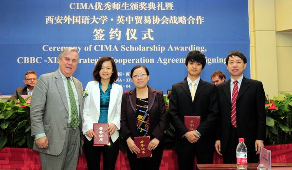 在热烈的掌声中,户思社校长与英国英中贸易协会总裁Stephen Philips先生代表双方签署了战略合作协议,并为西安外国语大学首届CIMA优秀学生及优秀教师颁奖。NG体育 2009级商务英语专业CIMA方向教改班的刘会杰同学获得了CIMA英国皇家特许管理会计师公会授予的“CIMA学习标兵奖”,任泽静同学获得了“CIMA单科优秀奖”,2009级商务英语CIMA教改班获得了“优秀班级集体奖”,王敏、毕可佳、孙婧文等三位任课教师获得了“CIMA中国优秀教师奖”。