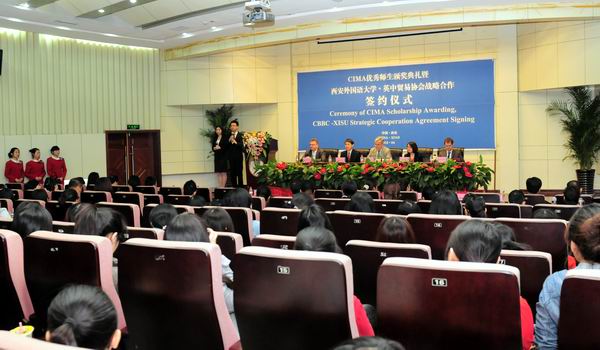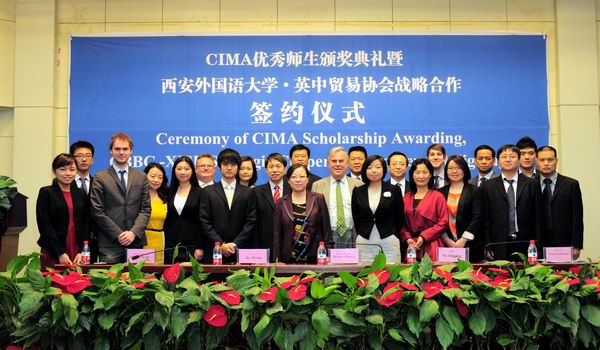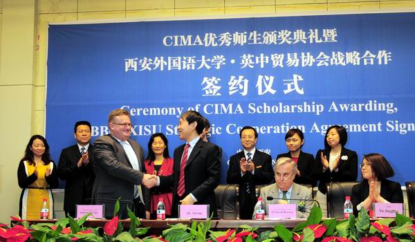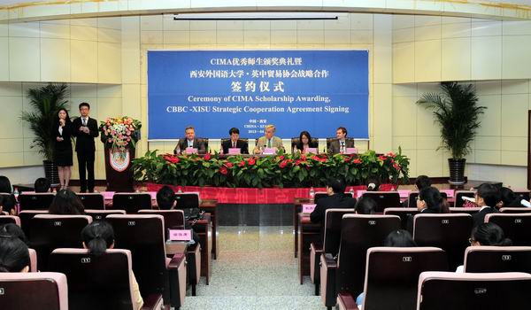 2013年4月25日上午,我校与英中贸易协会战略合作签约仪式暨CIMA 优 秀 师 生 颁 奖 典 礼在学校行政楼报告厅隆重举行。英中贸易协会主席David Brewer爵士、总裁Stephen Philips先生、西安代表处首席代表冯赟女士、CIMA英国皇家特许管理会计师公会中国核心市场总监于晶晶女士、英国驻华大使馆北方地区合作处二等秘书Tom de Fonblanque先生以及校长户思社、教务处处长兼NG体育 院长李雪茹,NG体育 副院长杨霞以及经济金融学院、英文学院等院系、教研室主任和部分师生出席了签约仪式。