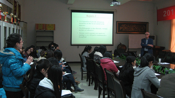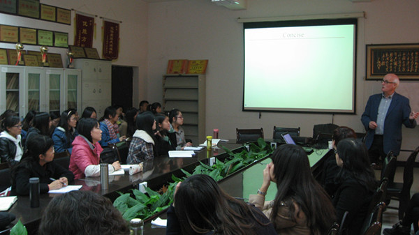在题为“Business Writing—Letters, Emails, and Reports“的讲座中,他结合自己在国际教育交流与合作领域17年的写作经验,按照商务写作的七个准则,准确(Correctness)、清楚(Clearness)、简明(Conciseness)、具体(Concreteness)、完整(Completeness)、礼貌(Courtesy)、体谅(Consideration),从称呼讲起,强调写作人员应注意读者的身份,考虑写作的预期目的,合理布局,清晰表达。在题为“TheDifference—British and America Culture and Society”的讲座中,他沿着英美两国的历史线索,分析两国在文化与社会生活方面的异同,以历史发展的视角讨论跨文化交际中的认同和差异。